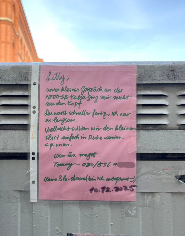 Im Supermarkt verliebt – Kassiert man hier eine zweite Chance? Im Supermarkt verliebt – Kassiert man hier eine zweite Chance? Entdeckt von Bori in der Spandauer Straße in Mitte. Bitte dieses Feld leer lassenNOTESLETTER Für Dich zusammengestellt: Die Crème de la Crème seriöser Hauptstadt-Notizen. Ja, ich will dabei sein und akzeptiere die Datenschutzerklärung Fast geschafft! Prüfe deinen Posteingang oder Spam-Ordner, um dein Abonnement zu bestätigen. Leave a comment FacebookXPinterestE-MailWhatsApp