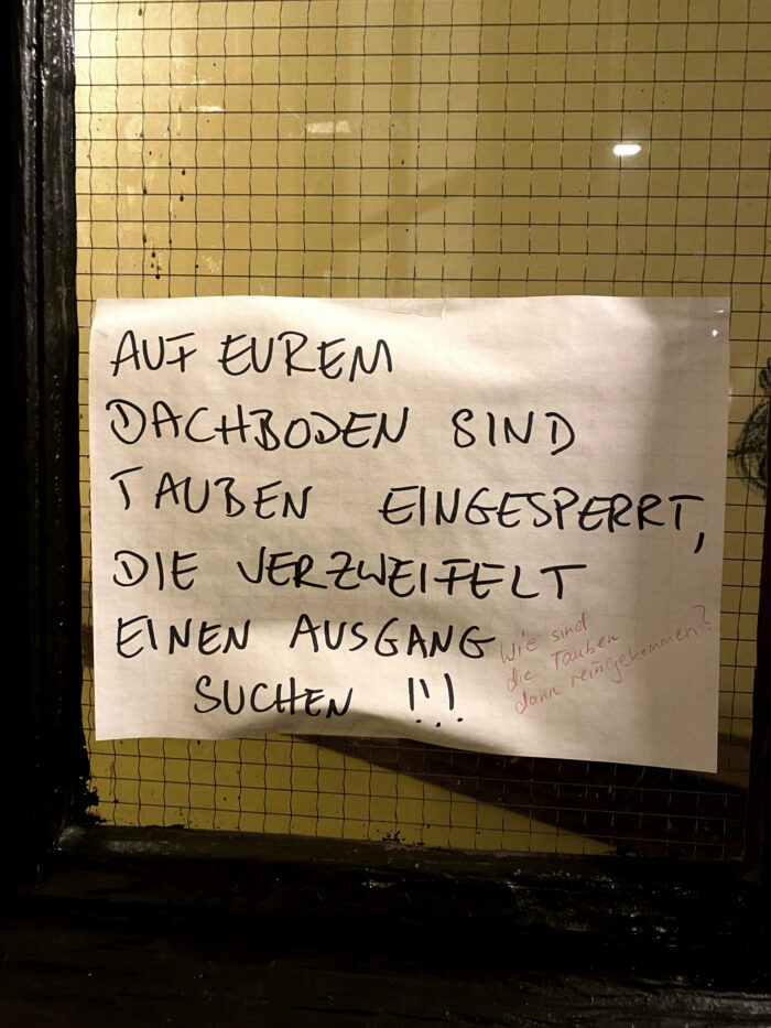 Tauben auf dem Dachboden – Wo geht’s denn wieder raus? Tauben auf dem Dachboden – Wo geht’s denn wieder raus? Entdeckt von Abby in der Obentrautstraße in Friedrichshain. Bitte dieses Feld leer lassenNOTESLETTER Für Dich zusammengestellt: Die Crème de la Crème seriöser Hauptstadt-Notizen. Ja, ich will dabei sein und akzeptiere die Datenschutzerklärung Fast geschafft! Prüfe deinen Posteingang oder Spam-Ordner, um dein Abonnement zu bestätigen. Leave a comment FacebookXPinterestE-MailWhatsApp